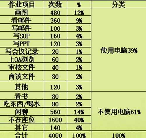 (2)做出結(jié)論,改進(jìn)工作。例:在辦公室,對(duì)20臺(tái)電腦使用情況實(shí)施8天的抽查,每天抽查25次,抽查結(jié)果如下表: