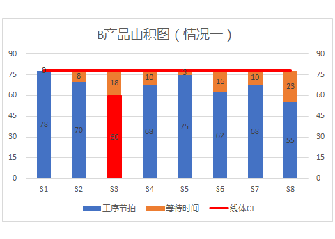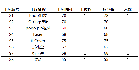 S3工序通過增加組裝治具,優(yōu)化作業(yè)方法,時間從80S降低至60S,其他工序數(shù)據(jù)不變。