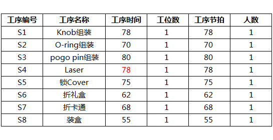 S4工序由于設備老化,設備時間增加,工序時間從68S提升至78S,其他工序數(shù)據(jù)不變。